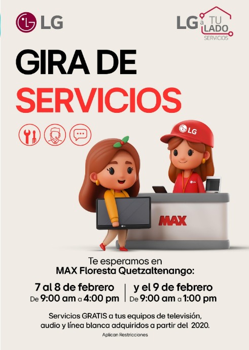 LG Electronics invita a todos los quetzaltecos a aprovechar su exclusiva Gira de Servicios, que se llevará a cabo en MAX La Floresta, ubicada en la Avenida Las Américas, zona 9 de Quetzaltenango.