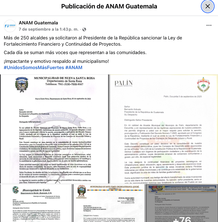 La Asociación Nacional de Municipalidades (Anam) publicó en sus redes sociales los pronunciamientos de 250 alcaldes (pero solo hay 185 cartas subidas) donde solicitan al presidente de la república, Bernardo Arévalo, que sancione el decreto 07-2025. Es la Ley para el Fortalecimiento Financiero y Continuidad de Proyectos de Codede. El mismo texto en distinta hoja membretada, nombre de la comuna y jefe edil.