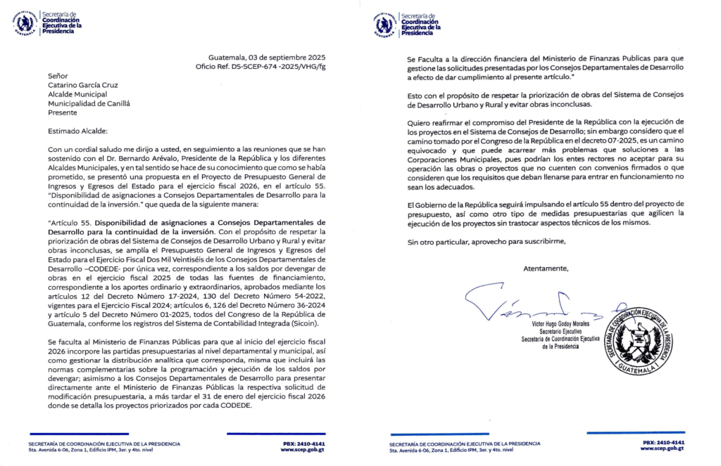 El 3 de septiembre, el secretario de Coordinación Ejecutiva de la Presidencia (SCEP), Victor Hugo Godoy, envió oficios a todos los alcaldes. En ellos expresa el compromiso del Ejecutivo de prolongar el uso de los fondos extraordinarios, del art 55 de la propuesta de la Ley del presupuesto de 2026.