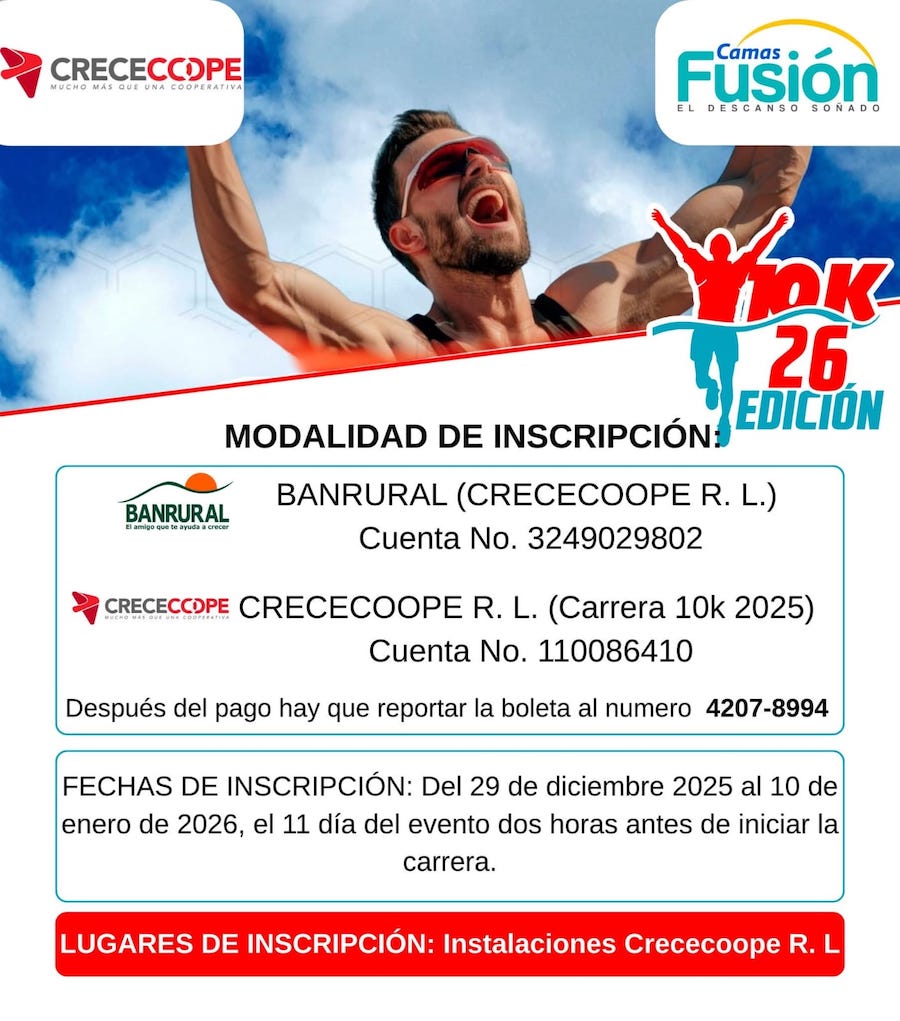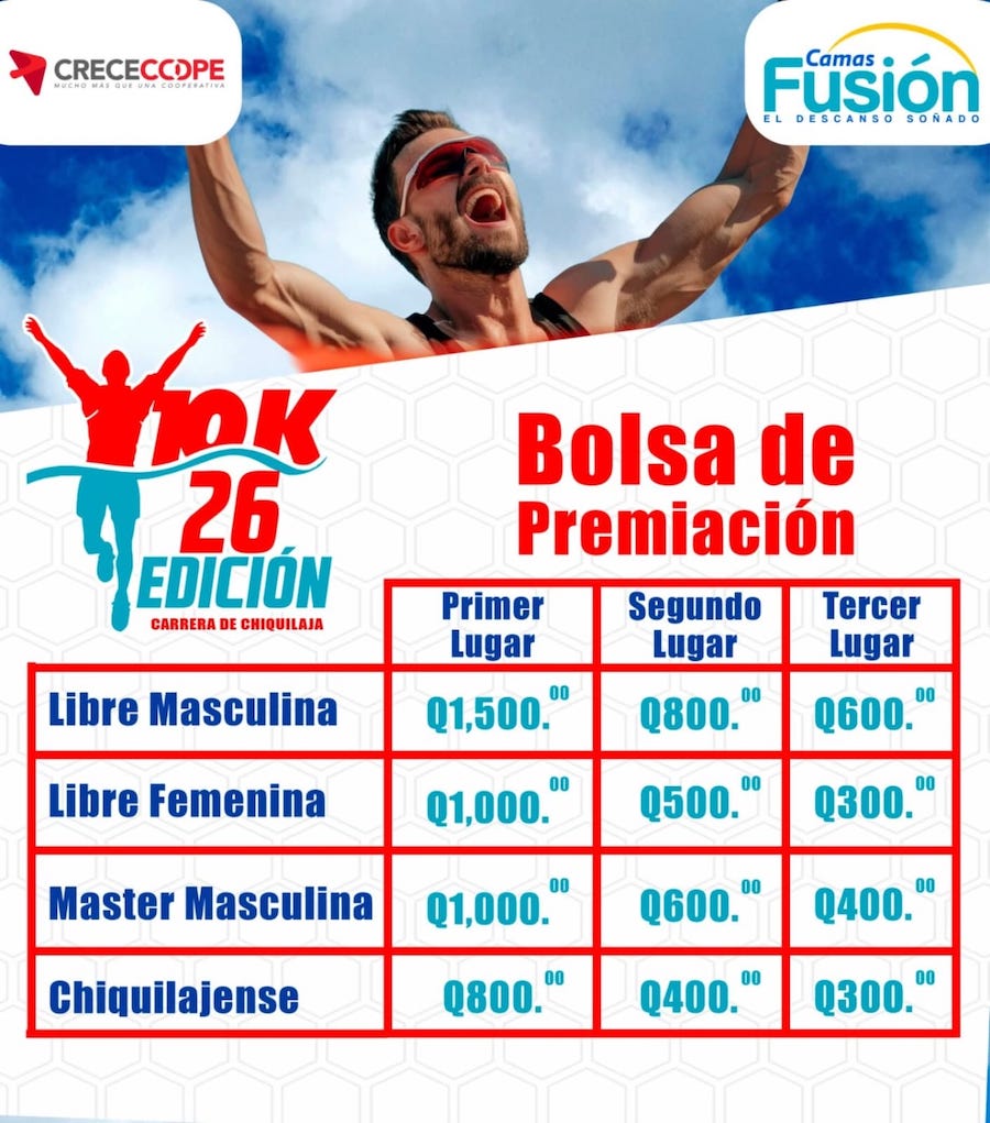 Félix Huinac Reynoso, integrante del comité organizador, informó que las inscripciones ya están abiertas y tienen un costo de Q100, monto que incluye un kit con playera, medalla y número. Además, los participantes ingresarán a una rifa con premios, entre ellos una cama matrimonial, un calentador solar y una bicicleta.