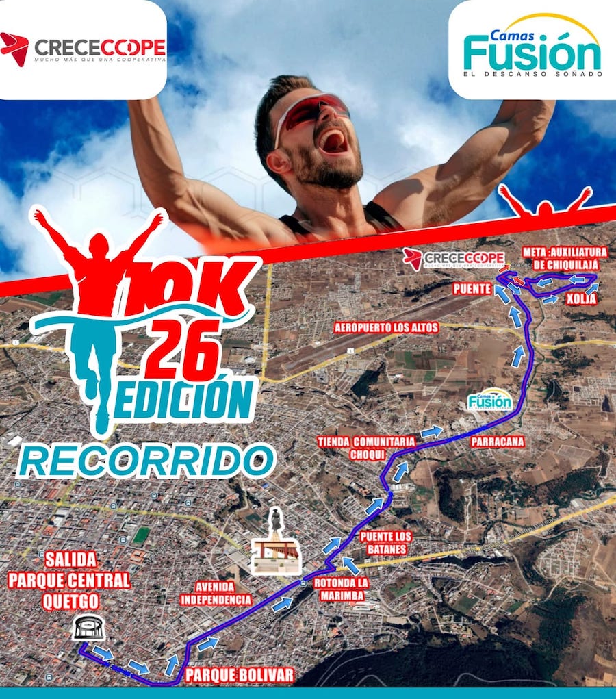 La competencia pedestre contará con un recorrido de 10 kilómetros, que iniciará en el Parque Central de Quetzaltenango y concluirá frente a la Iglesia católica y la Auxiliatura de Chiquilajá. Durante el trayecto, los corredores pasarán por puntos emblemáticos como la avenida La Independencia, la rotonda de La Marimba y el puente Los Batanes, entre otros sectores.