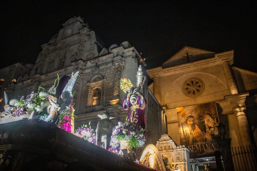 El recorrido incluyó puntos emblemáticos como la Plazuela San Antonio, el parque Bolívar y el parque Centroamérica, hasta culminar con el ingreso solemne a la Catedral Metropolitana, acompañado por marchas fúnebres y un ambiente cargado de espiritualidad.