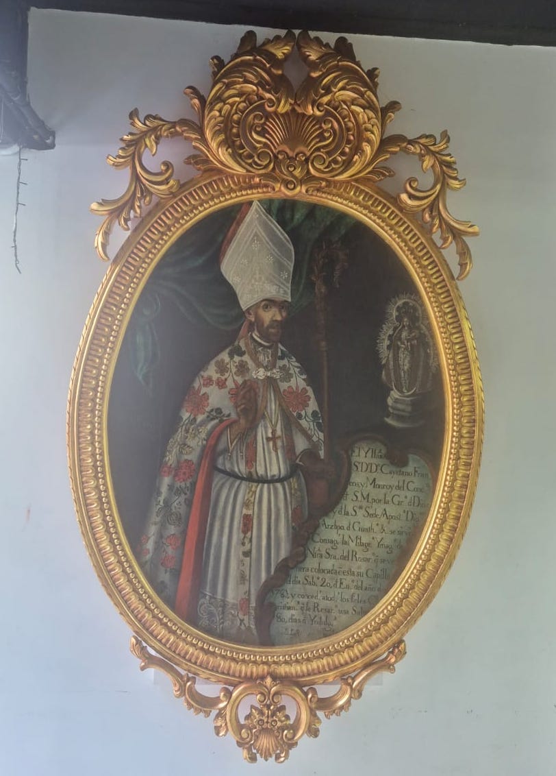-Se trata de un retrato del arzobispo Fray Cayetano Francos y Monroy, quien fue el encargado de consagrar la imagen de la Virgen del Rosario en 1781. Es un momento histórico importantísimo para la fe de Quetzaltenango y para la imagen de la Virgen, una de las primeras consagradas.