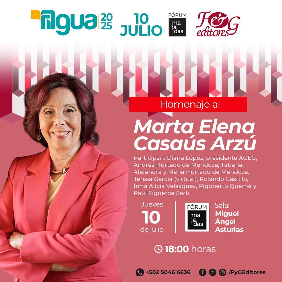 En 2025 la Filgua estará dedicada a Marta Elena Casaús Arzú, doctora en Ciencias Políticas y Sociología, quien ha hecho notables contribuciones para comprender nuestro país y esta tarde a partir de las 18 horas, se le hará su homenaje.