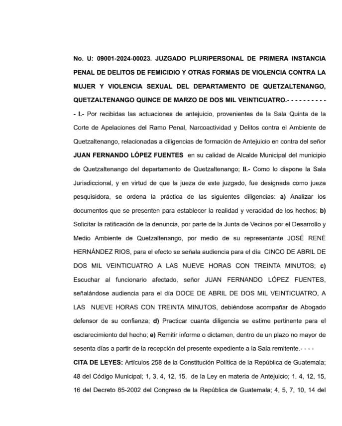 La denuncia de “ecocidio”, planteada por la Junta de Vecinos por el Desarrollo y Medio Ambiente de Quetzaltenango (JVDMAQ) contra el alcalde Juan López sigue su curso.