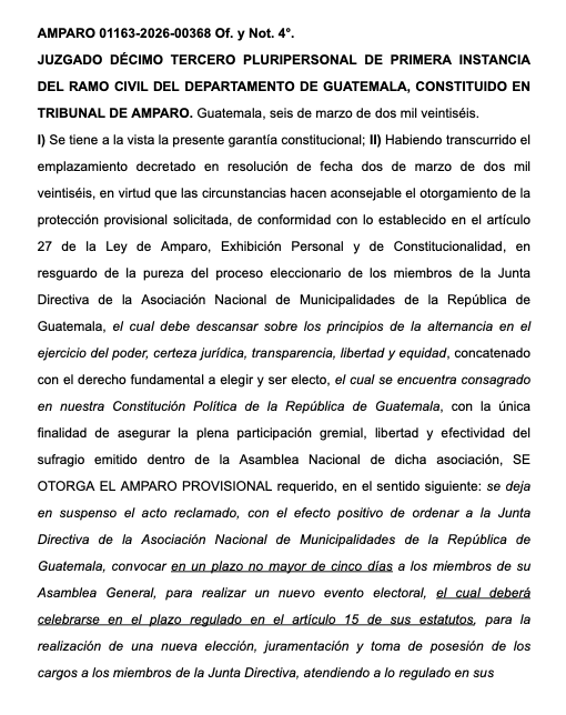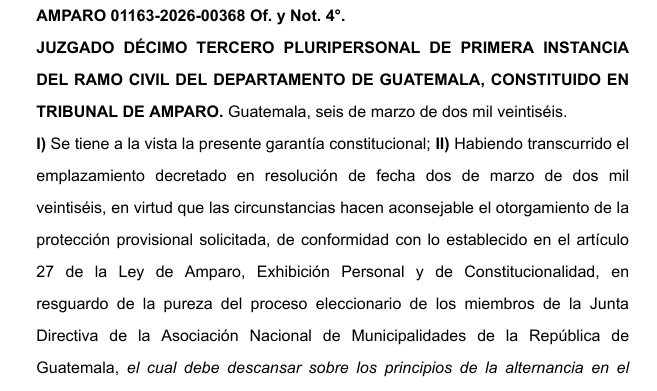 El Juzgado Décimo Tercero Pluripersonal de Primera Instancia del Ramo Civil del departamento de Guatemala, otorgó un amparo provisional que suspende el proceso de elección de la junta directiva de la Asociación Nacional de Municipalidades (Anam).