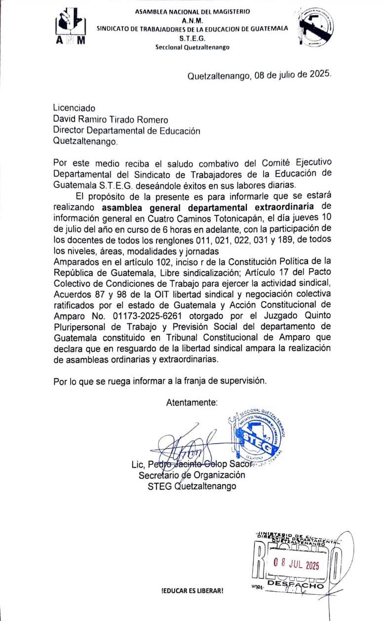 El Ministerio de Educación (Mineduc) advirtió sobre una acción convocada por la seccional del Sindicato de Trabajadores de la Educación de Guatemala (STEG) en Quetzaltenango.