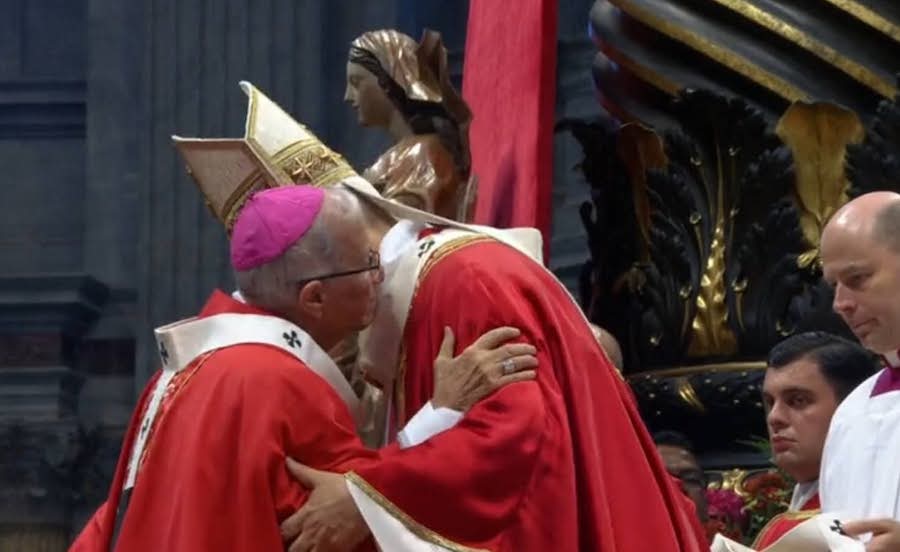 El papa León XIV presidió la misa en la solemnidad de los santos patronos en el altar de la Confesión de la Basílica de San Pedro en Ciudad del Vaticano con la bendición e imposición del palio a 54 arzobispos metropolitanos de todo el mundo.