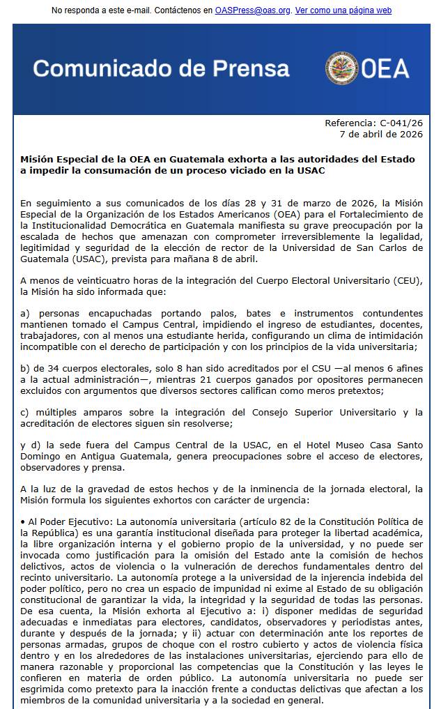 Al poder Ejecutivo: La autonomía universitaria (artículo 82 de la Constitución Política de la República) es una garantía institucional diseñada para proteger la libertad académica, la libre organización interna y el gobierno propio de la universidad, y no puede ser invocada como justificación para la omisión del Estado ante la comisión de hechos delictivos, actos de violencia o la vulneración de derechos fundamentales dentro del recinto universitario”, cita el comunicado de la Misión Especial de la Organización de la OEA.