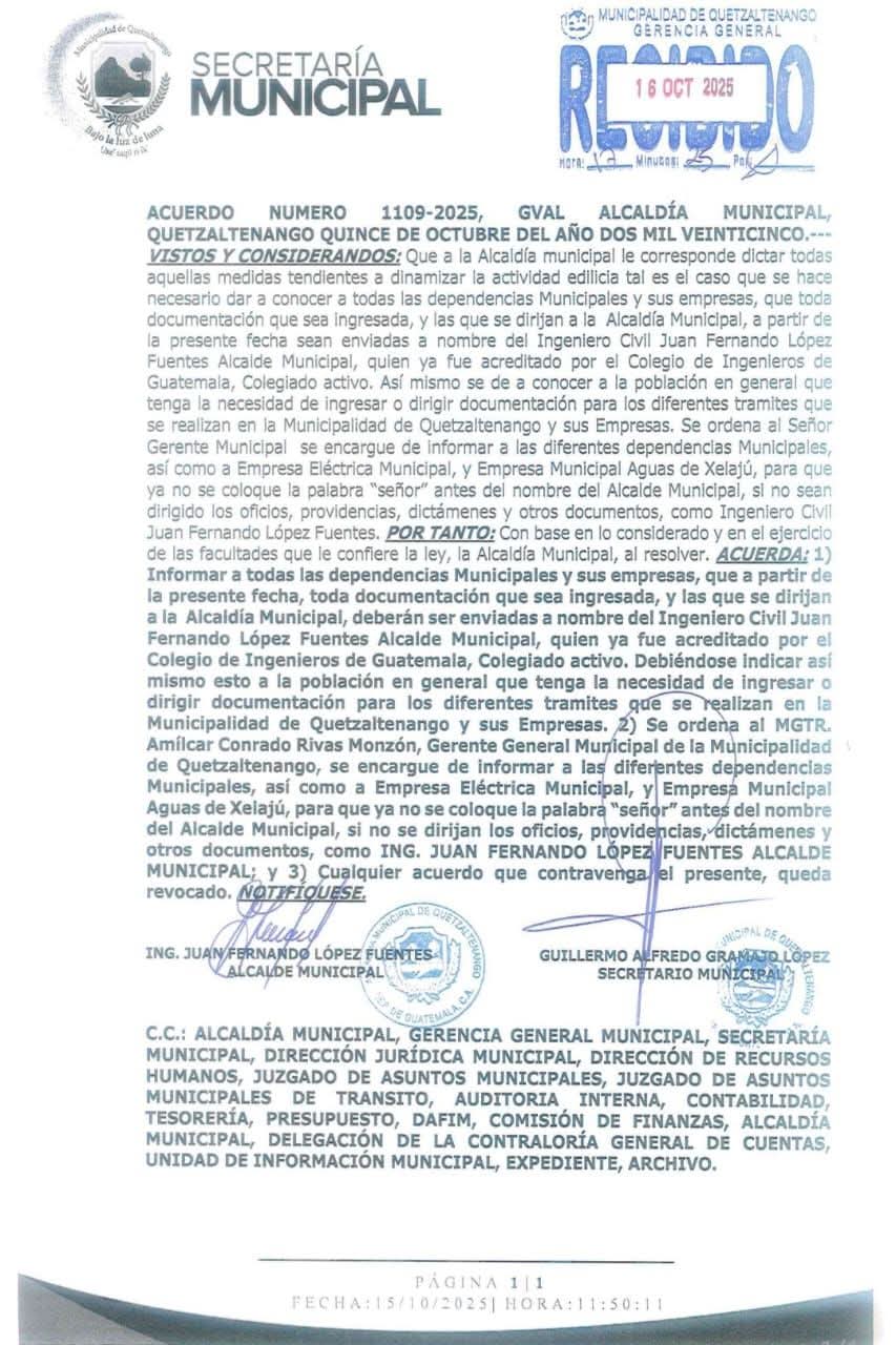 A partir del 18 de octubre de 2025, Juan López, alcalde de Xela, es ingeniero por acuerdo del Colegio de Ingenieros. A cambió les cedió un terreno para su sede.