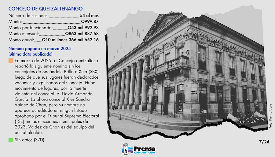 Este monto supera ampliamente los pagos en otras municipalidades, como la capital, donde por 12 sesiones al mes se pagan Q13 mil 200 en dietas, y equipara los ingresos que reciben los concejales de Mixco, donde se realizan 15 sesiones y se pagan hasta Q60 mil.