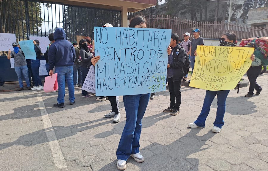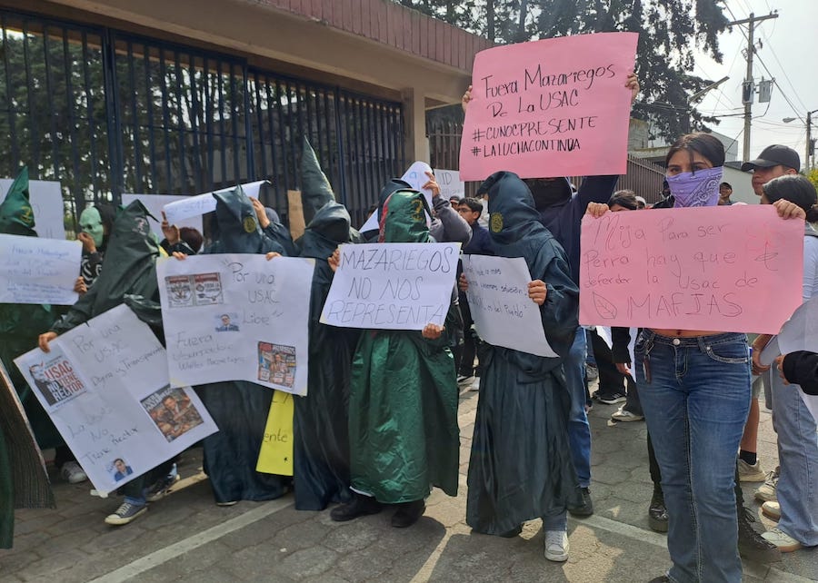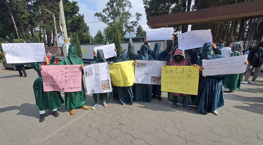 Los manifestantes calificaron el proceso como ilegítimo y denunciaron irregularidades que, según indicaron, buscan asegurar la continuidad de Mazariegos en el cargo. También lo señalaron como un “rector impuesto”, al considerar que no cuenta con el respaldo de la comunidad universitaria ni de cuerpos electorales independientes.