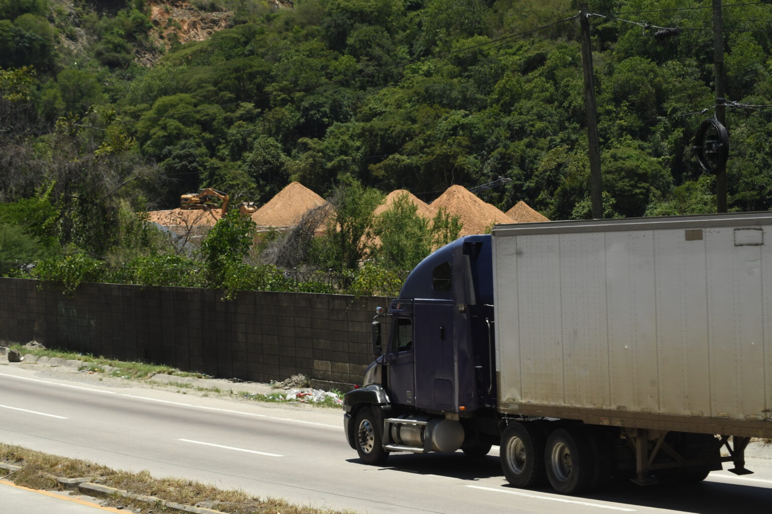 A lo largo de la carretera que cruza San Antonio La Paz se observa el muro de contención que separa la mina El Sastre del tráfico diario. Desde sus casas, los vecinos ven y escuchan el funcionamiento de la maquinaria pesada. Foto: Alex Cruz.