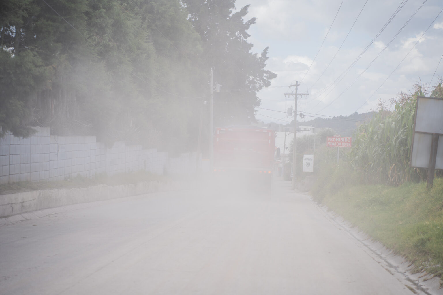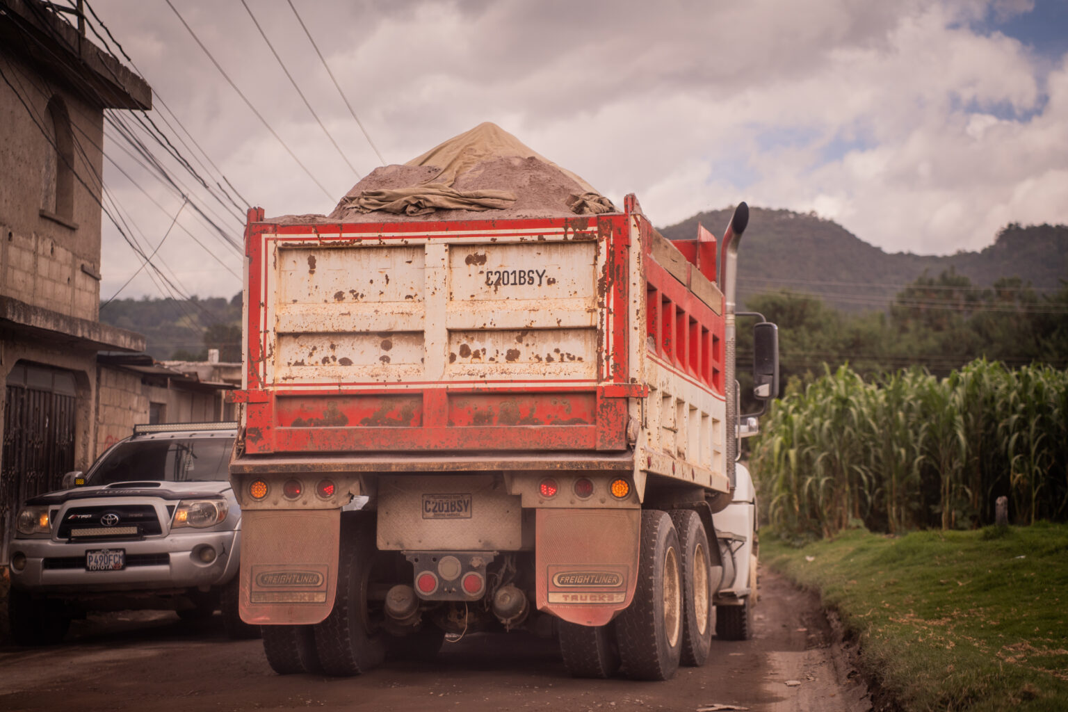 Decenas de camiones de la mina Piedra Azul atraviesan a diario el barrio Tierra Colorada Baja, en el Valle de Palajunoj, Quetzaltenango, cargados de roca. Tras de sí dejan una estela de polvo que ya es parte habitual de la vida de los vecinos. Fotos: Henry González.